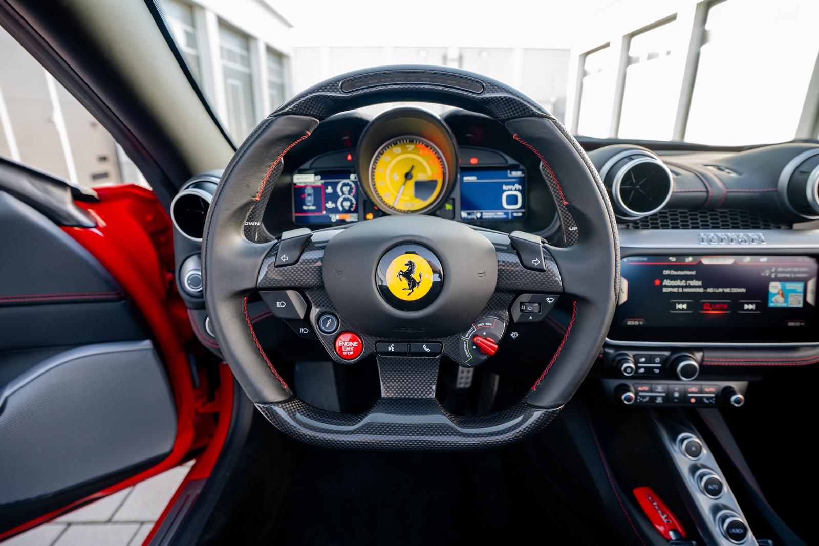 Wir freuen uns, Ihnen diesen Ferrari Portofino aus 1. Hand in Rosso Corsa mit Interieur in Nero anbieten zu dürfen. Das Fahrzeug überzeugt durch seine klassische und zugleich sportliche Konfiguration mit zahlreichen Carbon-Elementen sowie gelben Kontrastdetails. Die Fahrzeugfront wurde zum Schutz mit einer Steinschlagschutzfolie versehen. Eine äußerst stimmige Spezifikation mit Scuderia Shields, 20-Zoll Schmiederädern und umfangreicher Komfortausstattung. Wir freuen uns auf Ihre Kontaktaufnahme.